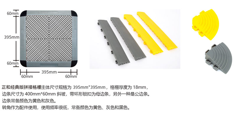 一套完整的拼接格柵產(chǎn)品由主體格柵、公邊條、母邊條、轉(zhuǎn)角四部分構(gòu)成,主體格柵的尺寸為395mm*395mm*18mm,厚度為18mm,邊條尺寸為400mm*60mm*8mm,轉(zhuǎn)角為扇形結(jié)構(gòu),尺寸規(guī)格為60mm*60mm*18mm。 拼接格柵通過一個(gè)簡(jiǎn)便互鎖接口設(shè)計(jì),重量輕,可拆卸,易于安裝。無(wú)需使用工具,即可快速構(gòu)建起堅(jiān)實(shí)的展示地板地面。 拼接格柵重量輕、結(jié)構(gòu)緊湊,便于運(yùn)輸或儲(chǔ)存?蓮V泛用作汽車4S店展臺(tái)地板、汽車美容店地面、汽車貼膜車間、美容車間以及客戶休息室等場(chǎng)所,同時(shí)也適用于展覽、展會(huì)等臨時(shí)性場(chǎng)所的地面鋪設(shè)。在幾乎所有有水的場(chǎng)所拼接格柵都能使用。
