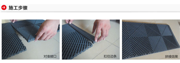 多功能拼接格柵具有高強(qiáng)承載、防水防油、色彩絢麗、施工簡(jiǎn)便、防水防污、無(wú)臭無(wú)毒等諸多優(yōu)點(diǎn),廣泛應(yīng)用于家庭陽(yáng)臺(tái)、汽車美容快修店、汽車4S店、洗浴中心、公共衛(wèi)生間、展覽展會(huì)、賓館酒店過道等場(chǎng)所。