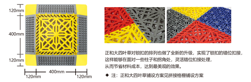 正和大四葉草采用通扣設(shè)計,可以確保產(chǎn)品鋪設(shè)完成后在任何區(qū)域單獨取出,極大的方便了客戶后期局部清理泥沙等,給店面的日常衛(wèi)生維護提供了很好的基礎(chǔ)。