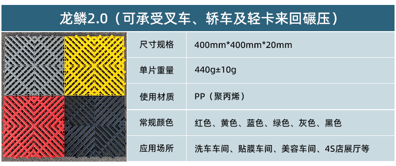 1.龍鱗紋設(shè)計(jì),防滑,美觀,寓意好 2.選用高級原料,加入其他輔料,顏色亮麗,無異味,無污染 3.顏色為紅黃藍(lán)綠黑灰六色,滿足客戶用色需求,搭配屬于自己的風(fēng)格 4.通扣鎖扣設(shè)計(jì),容易鋪設(shè)且容易拆卸打理 5.加強(qiáng)支撐,不容易出現(xiàn)壓壞壓斷現(xiàn)象,滿足大多數(shù)車輛施工的要求 6.使用年限長,3年超長質(zhì)保,使用無后顧之憂 7.不同厚度,采用不同支撐,保證承載最大化的同時(shí),且易排泥排水