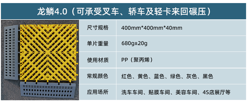 1.龍鱗紋設(shè)計(jì),防滑,美觀,寓意好 2.選用高級(jí)原料,加入其他輔料,顏色亮麗,無異味,無污染 3.顏色為紅黃藍(lán)綠黑灰六色,滿足客戶用色需求,搭配屬于自己的風(fēng)格 4.通扣鎖扣設(shè)計(jì),容易鋪設(shè)且容易拆卸打理 5.加強(qiáng)支撐,不容易出現(xiàn)壓壞壓斷現(xiàn)象,滿足大多數(shù)車輛施工的要求 6.使用年限長(zhǎng),3年超長(zhǎng)質(zhì)保,使用無后顧之憂 7.不同厚度,采用不同支撐,保證承載最大化的同時(shí),且易排泥排水