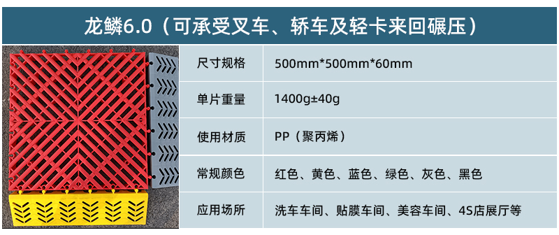 1.龍鱗紋設(shè)計(jì),防滑,美觀,寓意好 2.選用高級(jí)原料,加入其他輔料,顏色亮麗,無異味,無污染 3.顏色為紅黃藍(lán)綠黑灰六色,滿足客戶用色需求,搭配屬于自己的風(fēng)格 4.通扣鎖扣設(shè)計(jì),容易鋪設(shè)且容易拆卸打理 5.加強(qiáng)支撐,不容易出現(xiàn)壓壞壓斷現(xiàn)象,滿足大多數(shù)車輛施工的要求 6.使用年限長,3年超長質(zhì)保,使用無后顧之憂 7.不同厚度,采用不同支撐,保證承載最大化的同時(shí),且易排泥排水